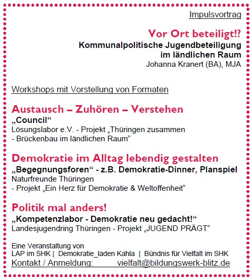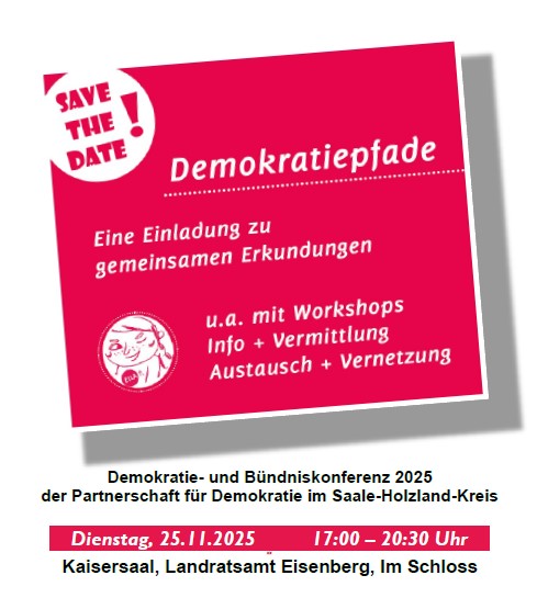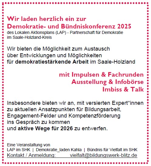 Der Lokale Aktionsplan (LAP) – Partnerschaft für Demokratie – im Saale-Holzland-Kreis (SHK) wird unterstützt durch das Bundesprogramm „Demokratie leben!“, das Thüringer Landesprogramm für Demokratie, Toleranz und Weltoffenheit „denk bunt“ sowie durch den Saale-Holzland-Kreis – und insbesondere durch die Akteurinnen und Akteure, die als kooperatives Netzwerk im Saale-Holzland zusammenwirken.
